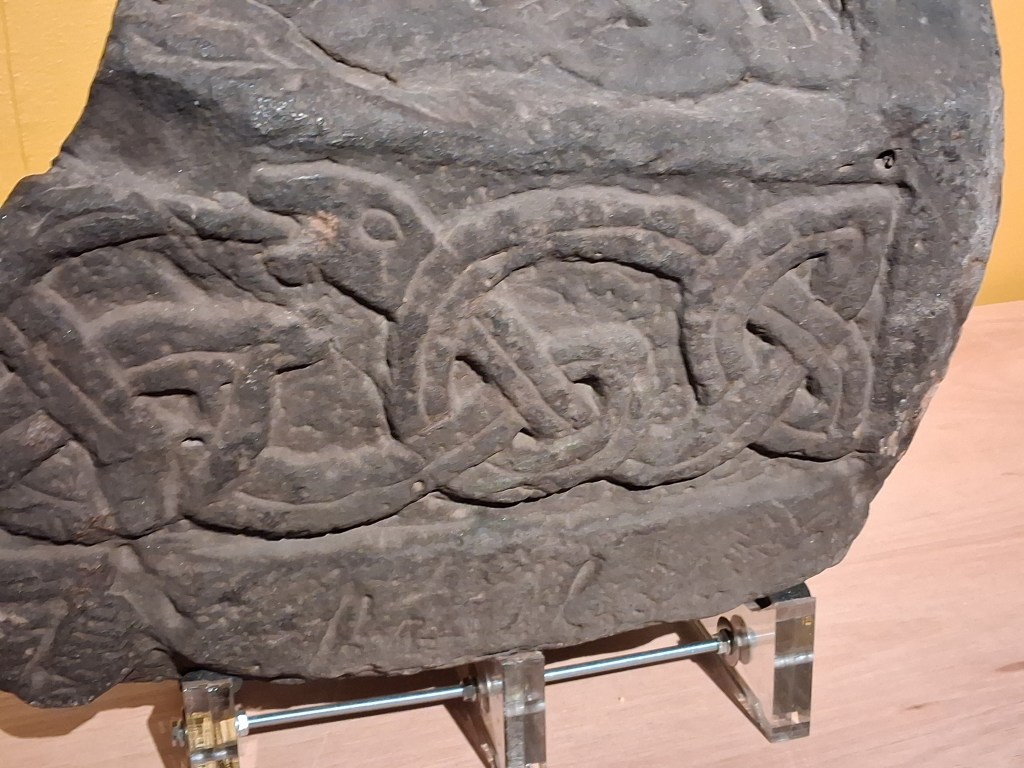 One face shows a Mamman style beast and the other faces show two or three stranded knotwork. The Corpus of Anglo Saxon Sculpture for Derbyshire and Staffordshire acknowledges the problems dating the stone and deciding if it is Mercian or Scandinavian but the fragment has design features that are similar to those on the hogback from St. Alkmund’s church in Derby (now in Derby Museum). Hogbacks are generally found in Scandinavian influenced areas and this one has the same double stranded knotwork with a pointed end going into the corners of the frame as found on the Ashbourne cross shaft. This confirms Viking influence across South Derbyshire